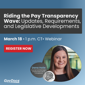 Eagan, Minn. - GovDocs, a leading provider of employment law compliance solutions, will host a complimentary webinar, Riding the Pay Transparency Wave: Updates, Requirements, and Legislative Developments, on Tuesday, March 18 at 1:00 PM CST.